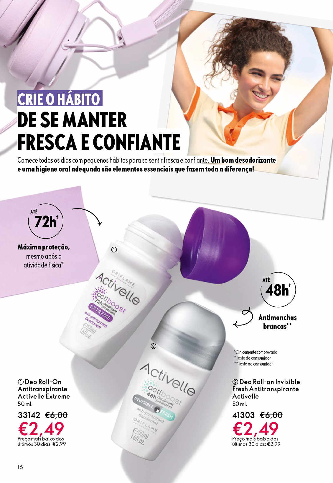 Deo Roll-On Antitranspirante 24h Invisible Activelle Beleza Oriflame - Proteção superior e frescura ao longo do dia, com fórmula Antimanchas brancas, para menos marcas na sua roupa. Proteção eficaz 24h. 50 ml.